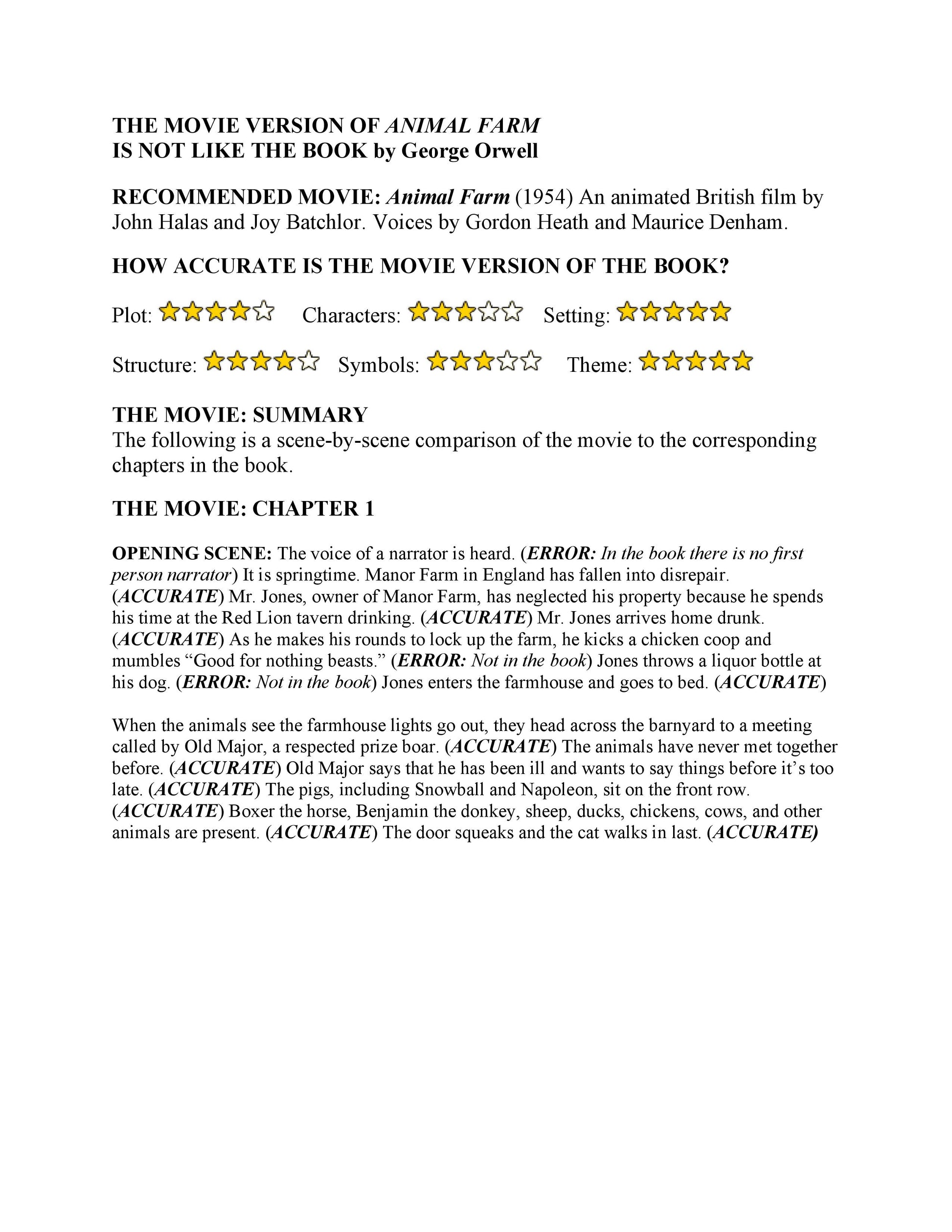 Study Guide compares the book Animal Farm by George Orwell to the movie Animal Farm (1954). An animated British film by John Halas and Joy Batchlor. Voices by Gordon Heath and Maurice Denham. This animated version of Animal Farm is fairly accurate except for the ending which is not like the ending in the book. Oddly, most of the nurturing female characters in the book are omitted from the movie, including: Clover the mare, Mollie the horse, Muriel the goat, and Mrs. Jones. This movie version of Animal Farm made history as the first cartoon that showed blood.