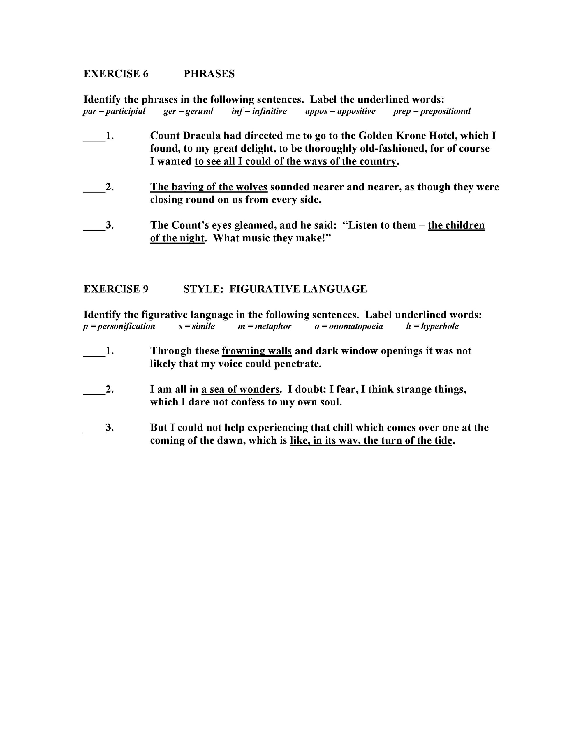 All sentences are from the novel. Sensory imagery establishes the iconic components of a vampire tale ("rattling chains," "sharp white teeth," "a deathly sickly odor," "garlic smell," "red light," "hinges creaked," "sulphurous fume," "howl of wolves").