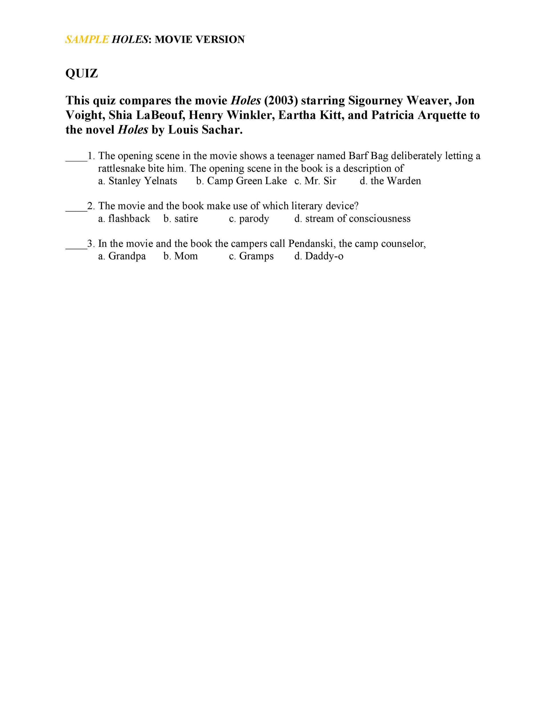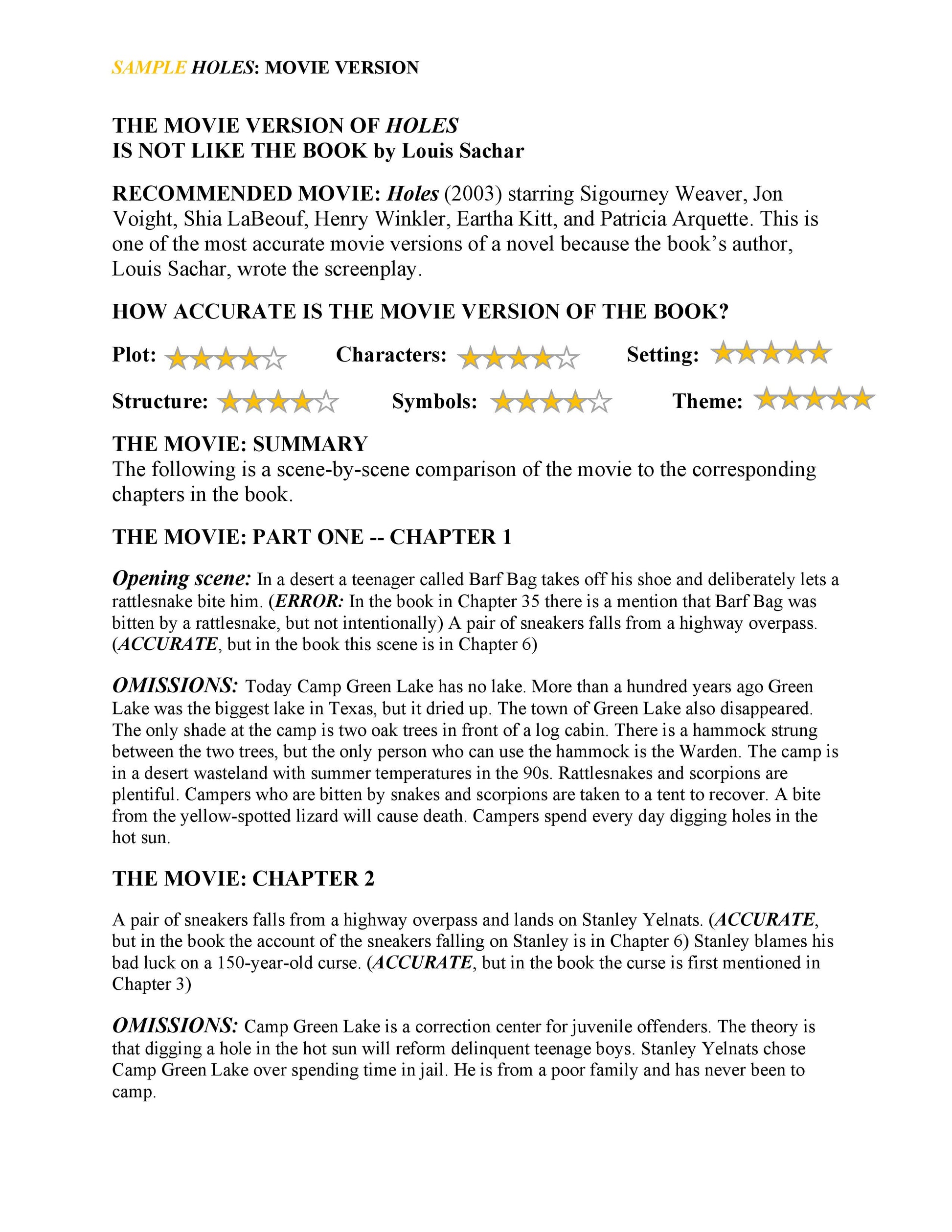 Study Guide compares the novel Holes by Louis Sachar to the movie Holes (2003) starring Sigourney Weaver, Jon Voight, Shia LaBeouf, Henry Winkler, Eartha Kitt, and Patricia Arquette. This is one of the most accurate movie versions of a novel because the book’s author, Louis Sachar, wrote the screenplay.
