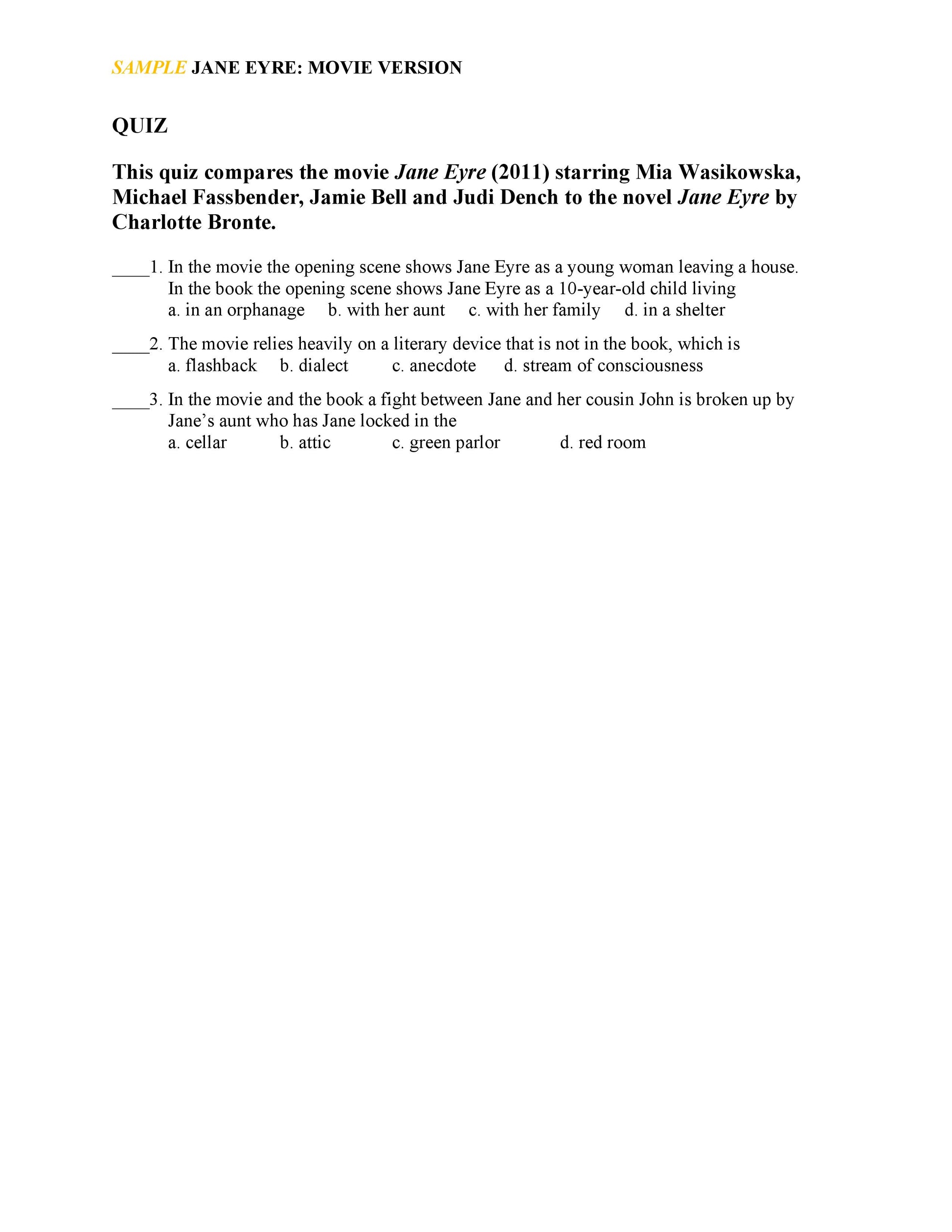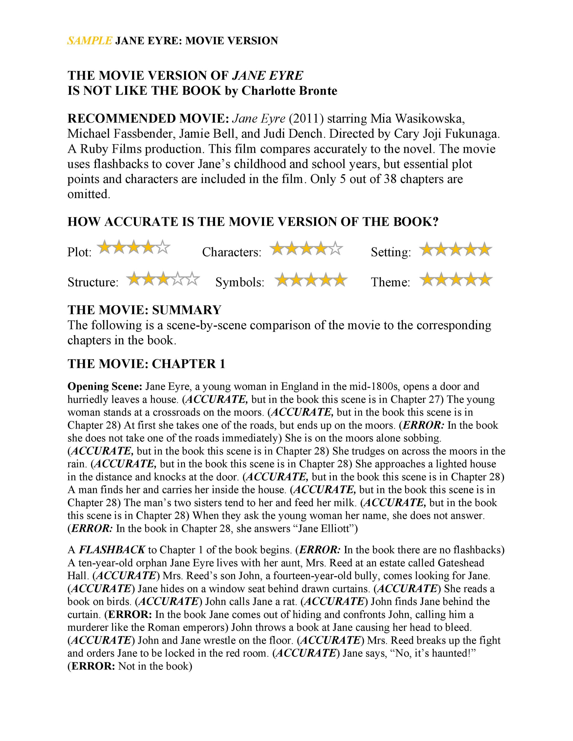 Study Guide compares the novel Jane Eyre by Charlotte Bronte to the movie version Jane Eyre (2011) starring Mia Wasikowska, Michael Fassbender, Jamie Bell, and Judi Dench. Directed by Cary Joji Fukunaga. A Ruby Films production. This film compares accurately to the novel. The movie uses flashbacks to cover Jane's childhood and school years, but essential plot points and characters are included in the film. Only 5 out of 38 chapters are omitted.