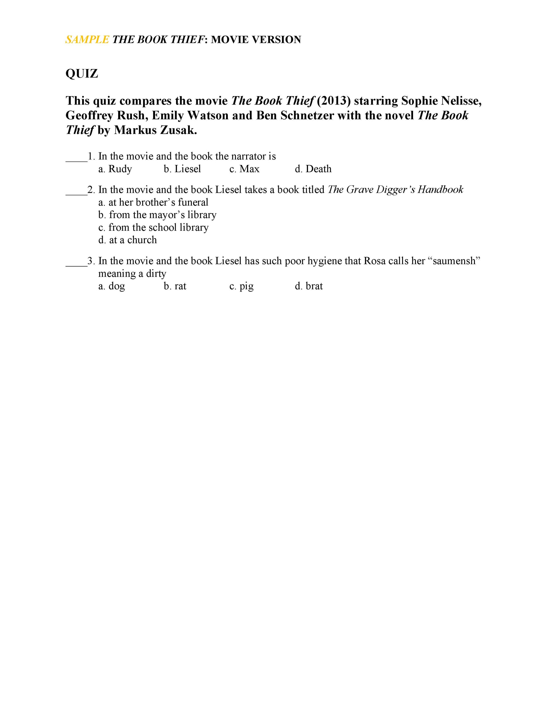 Study Guide compares the novel The Book Thief by Markus Zusak to the movie The Book Thief (2013) starring Sophie Nelisse, Geoffrey Rush, Emily Watson, and Ben Schnetzer. Directed by Brian Percival. Fox 2000 Pictures. The movie version accurately covers the main plot and themes of the book even though the movie omits 49 chapters. The movie was filmed in Germany and uses some of the dialogue from the book. The film deviates from the book a few times, but the changes do not alter the basic plot.
