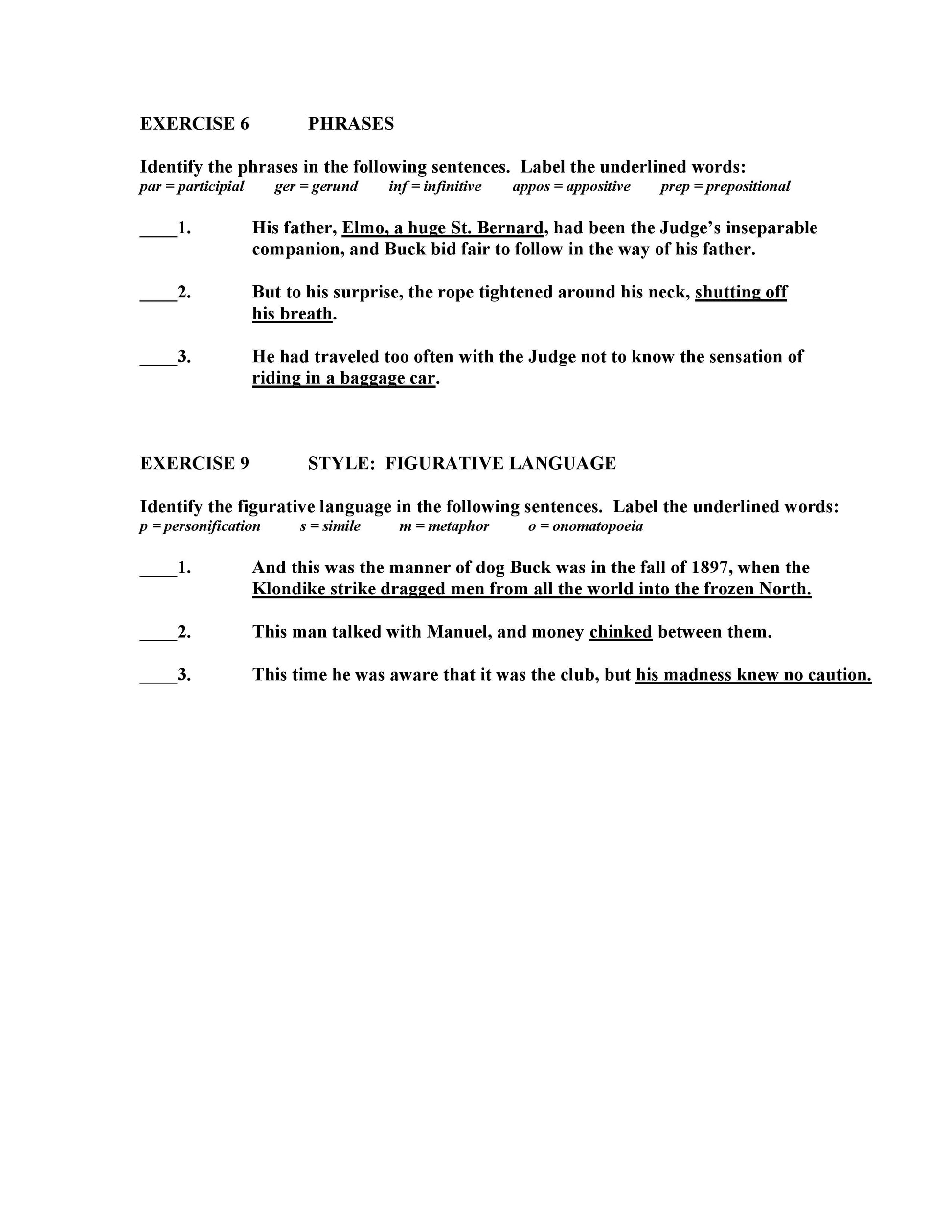 The main character is a dog which makes for interesting sentences that describe human behavior and the snowy Yukon wilderness from a dog's point of view. Allusions reflect the conflict in the story between civilized dog versus uncivilized dog and laws of civilization versus primordial instinct and lawlessness.