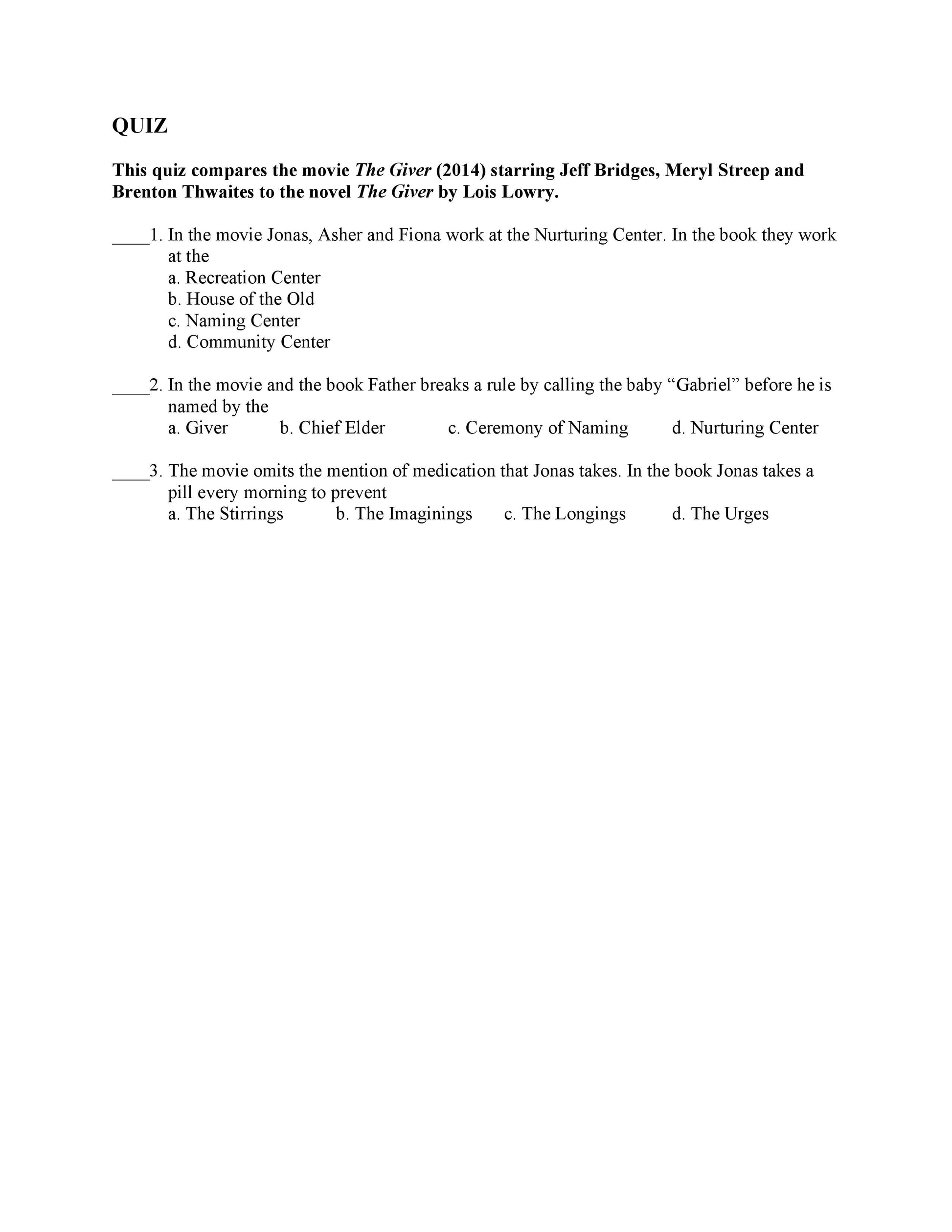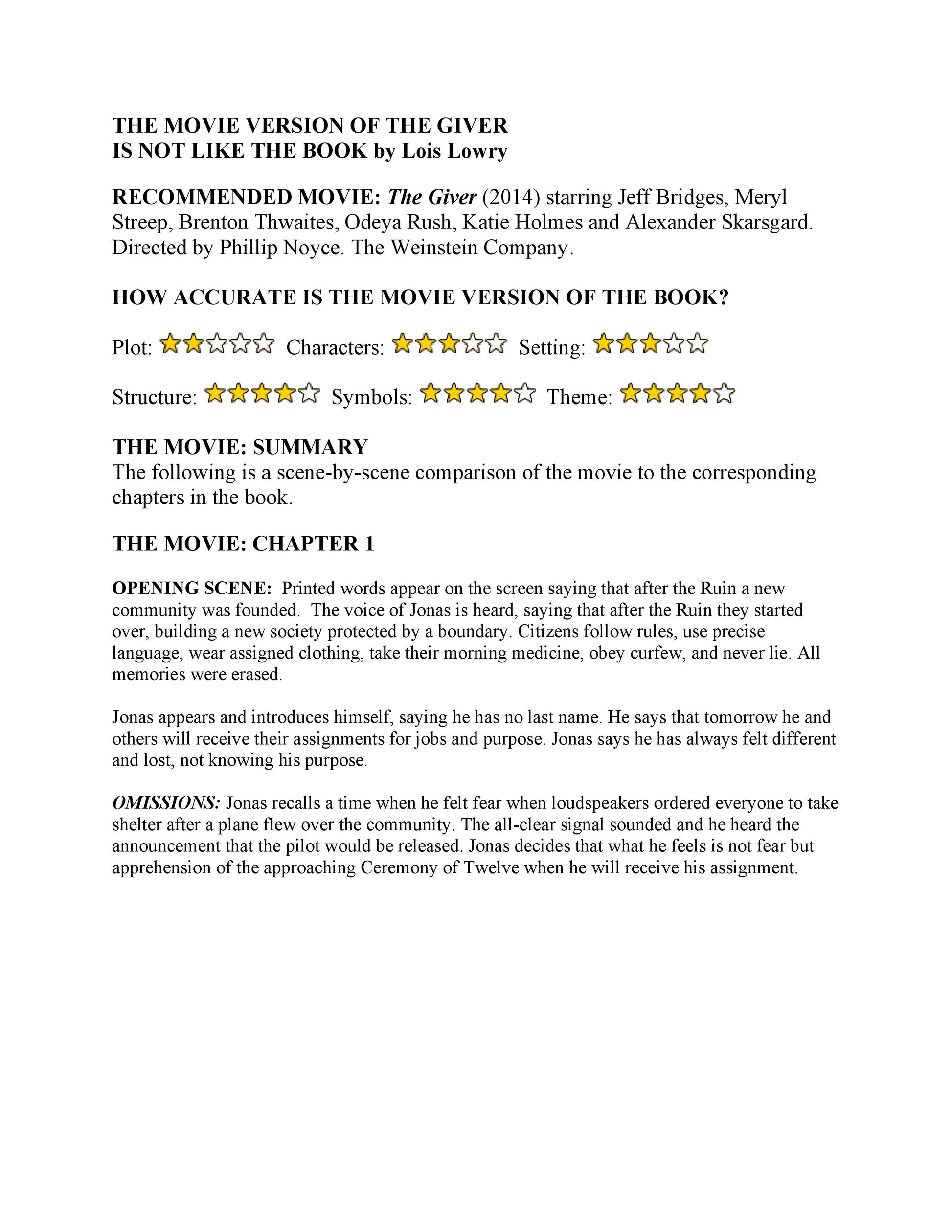 Study Guide compares the novel The Giver by Lois Lowry to the movie The Giver (2014) The movie version of The Giver is loosely based on the book. The bare bones of the plot are accurate and the themes and symbols in the book remain intact. The main differences are that in the book there is no romance between Jonas and Fiona, the Chief Elder is not a main character, there are no drones, Asher is not a pilot, and the Giver does not live in a house on the edge of the community.